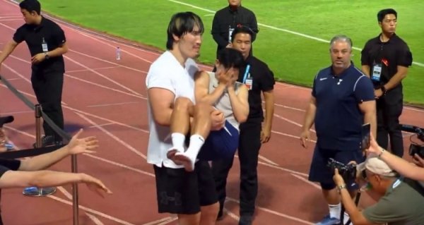娇羞孙哥😄孙兴慜被韩国2米18格斗明星公主抱,害羞得捂脸