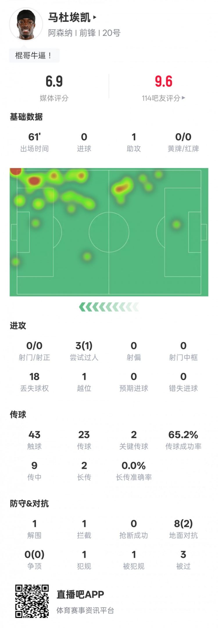 马杜埃凯本场数据:1助功 2关键传送球 1过人成功,评分6.9