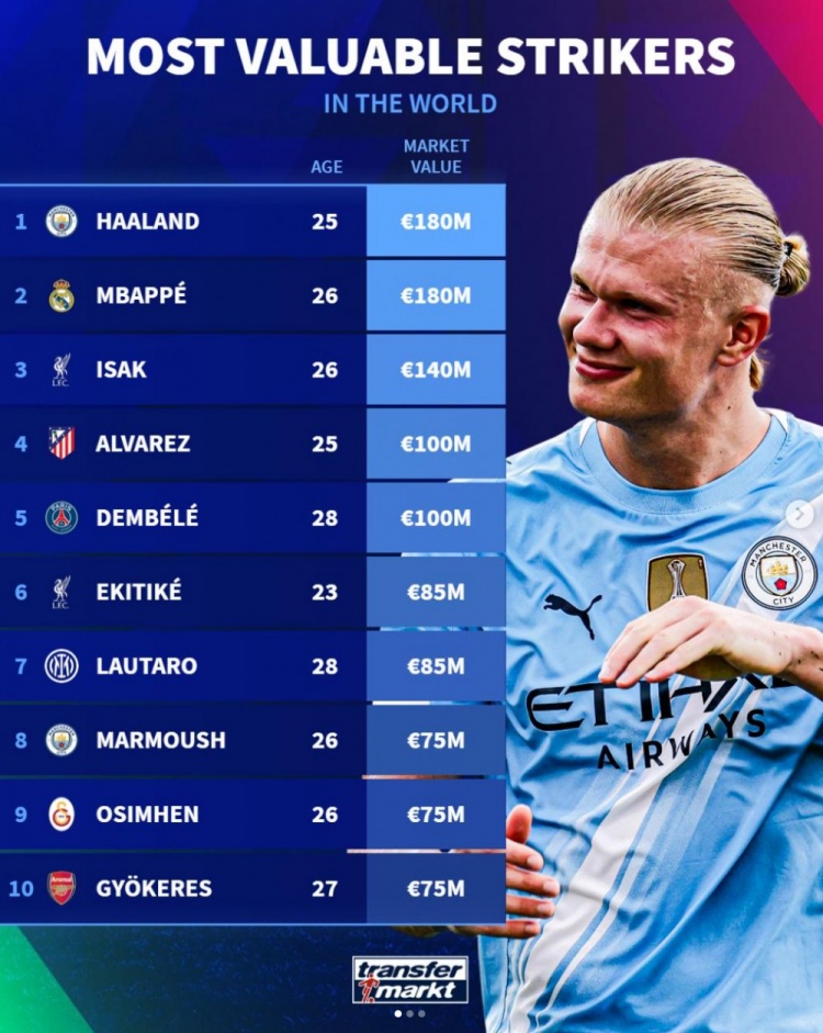 五号位德回转 价排行:哈兰德、姆巴佩1.8亿欧最高,伊萨克1.4亿欧