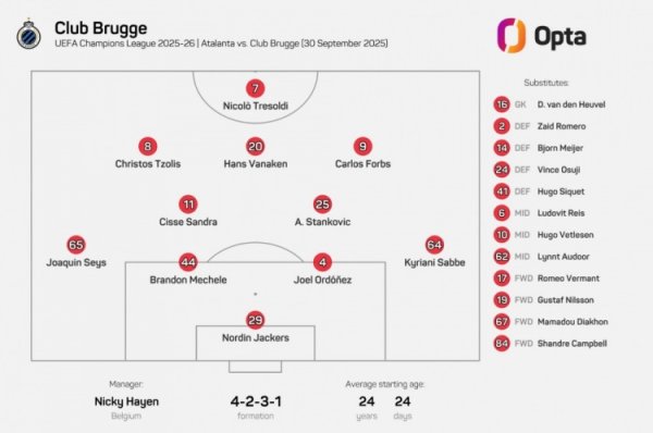 24岁24天!布鲁日排出欧冠历史平均年龄最年轻杆位阵形