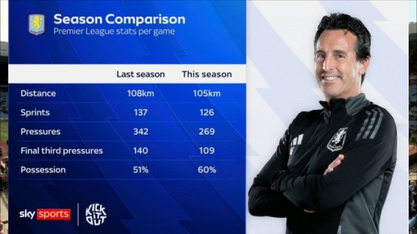 维拉本赛季与上赛季场均数据对比:移动距离 、冲刺跑 次数均下降