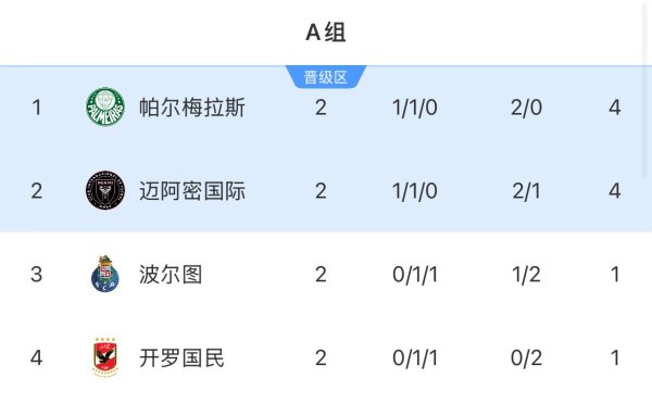 A组积分榜:帕尔梅拉斯、迈阿密排前2 下轮直接对决&打平携手出线